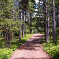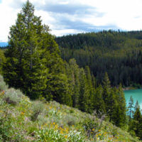 For those on foot, the trail delightfully winds through the trees, passing through a few meadows. Since it is a road, hikers can often hike three or four abreast with ease. After about 2 miles, the trail comes to a large open area with a view of the lake to the south and the Tetons to the east.